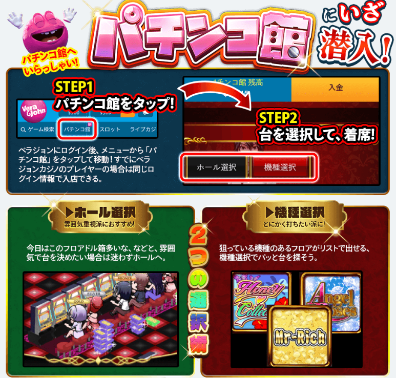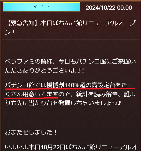 ベラジョンカジノでスロットで勝ちにいくなら「パチンコ館」がおすすめです。パチンコ館のスロットやパチンコには「設定」があり、各台の2日前~当日のデータもしっかりチェックすることができます。