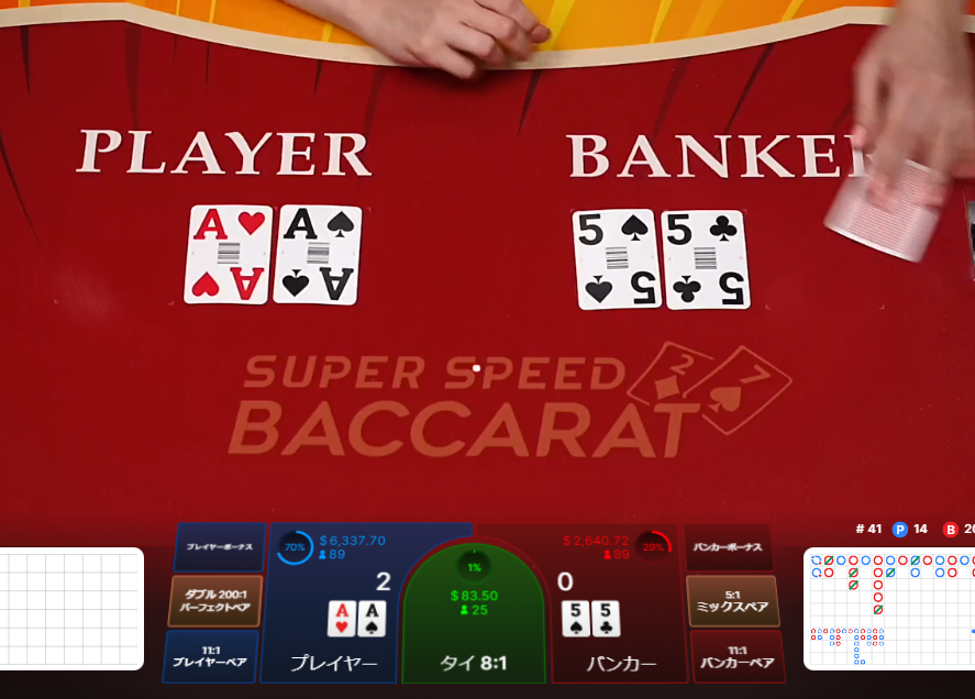 バカラはプレイヤーウィン、バンカーウィン、ドローの3通りの他に大きく分けて5種類のペアのサイドベットがあります。