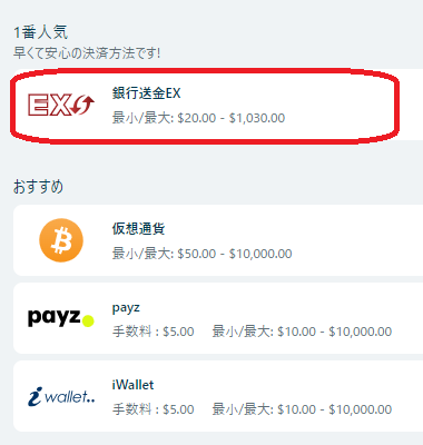 電子決済を持っていない、仮想通貨は使いたくない、という人は「銀行送金EX」がおすすめです。