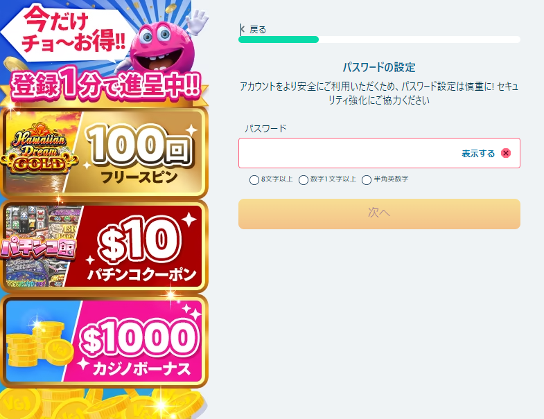 パスワードは「半角英数字で8文字以上、数字1字以上」という条件があります。