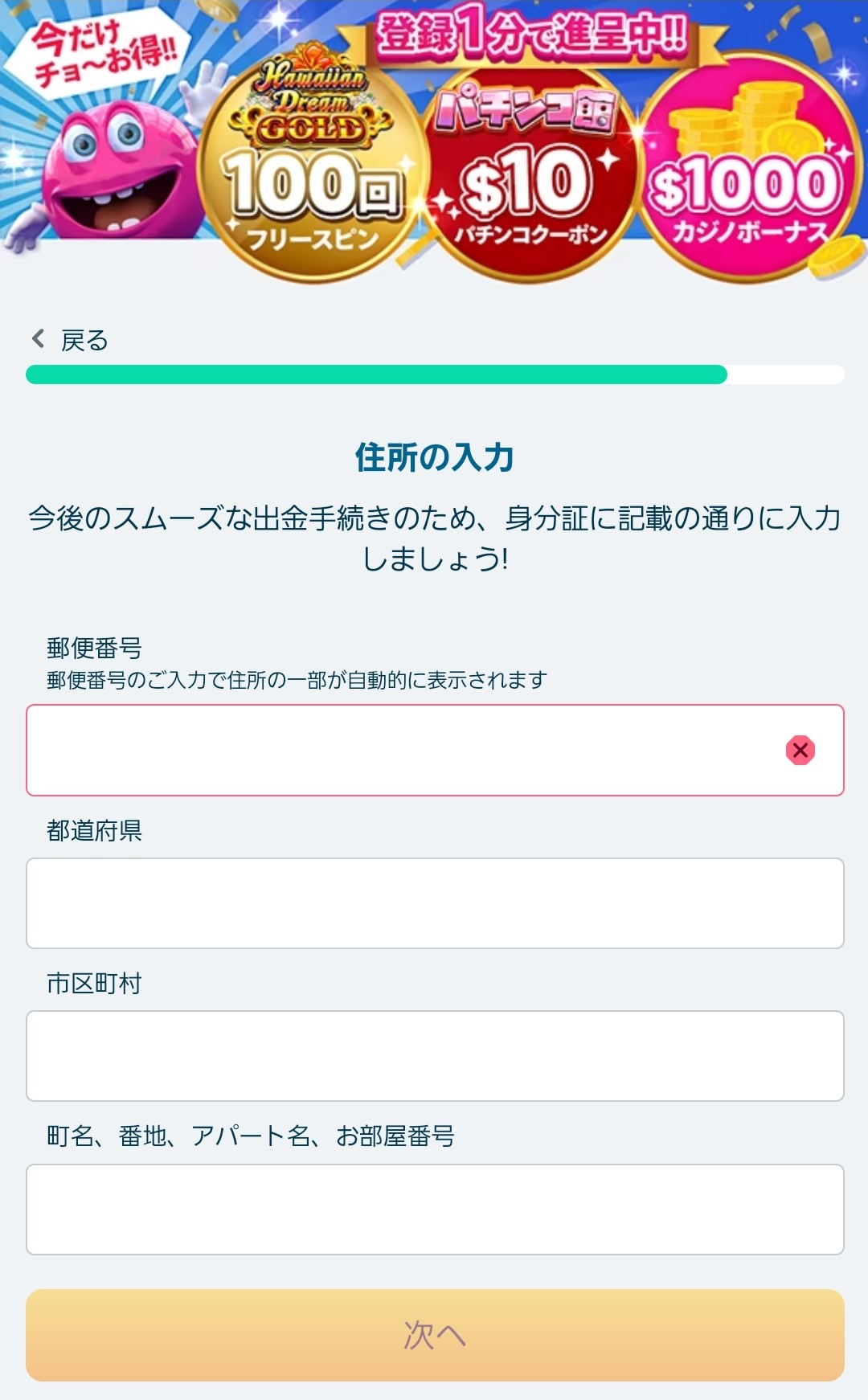 ※ある程度の金額(10,000ドル以上)を出金する時や出金方法として「銀行送金」を使う場合、ベラジョンカジノでは身分証などを提示しての「本人確認」が必須になるので必ず正確な住所と生年月日を入力してください。