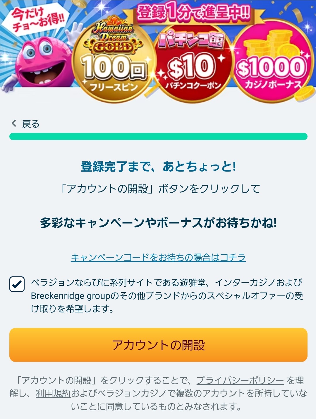 ※チェックはハズしても開設可能ですが、メールにはベラジョンカジノでプレイできる最新ゲームのリリース情報や賞金がもらえるカジノゲームのキャンペーン、ベラジョンカジノ独自のお得情報などが記載されているので、通知には積極的に目を通した方がベラジョンカジノをより一層楽しめると思います😆「遊雅堂」と「インターカジノ」はベラジョンカジノと同じ会社が運営するオンラインカジノです。個人情報が流出したり悪用されることはないので安心して下さい☆