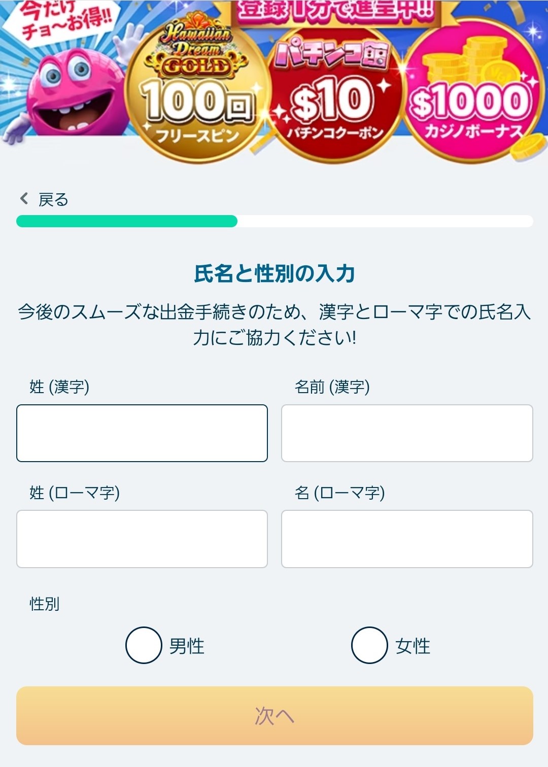 ・氏名と性別(氏名の下段はカタカナではなくローマ字で)